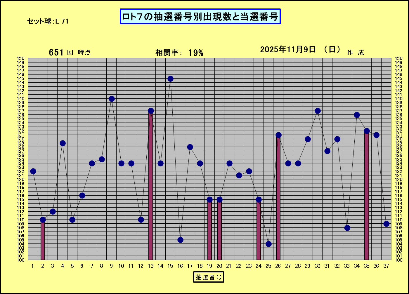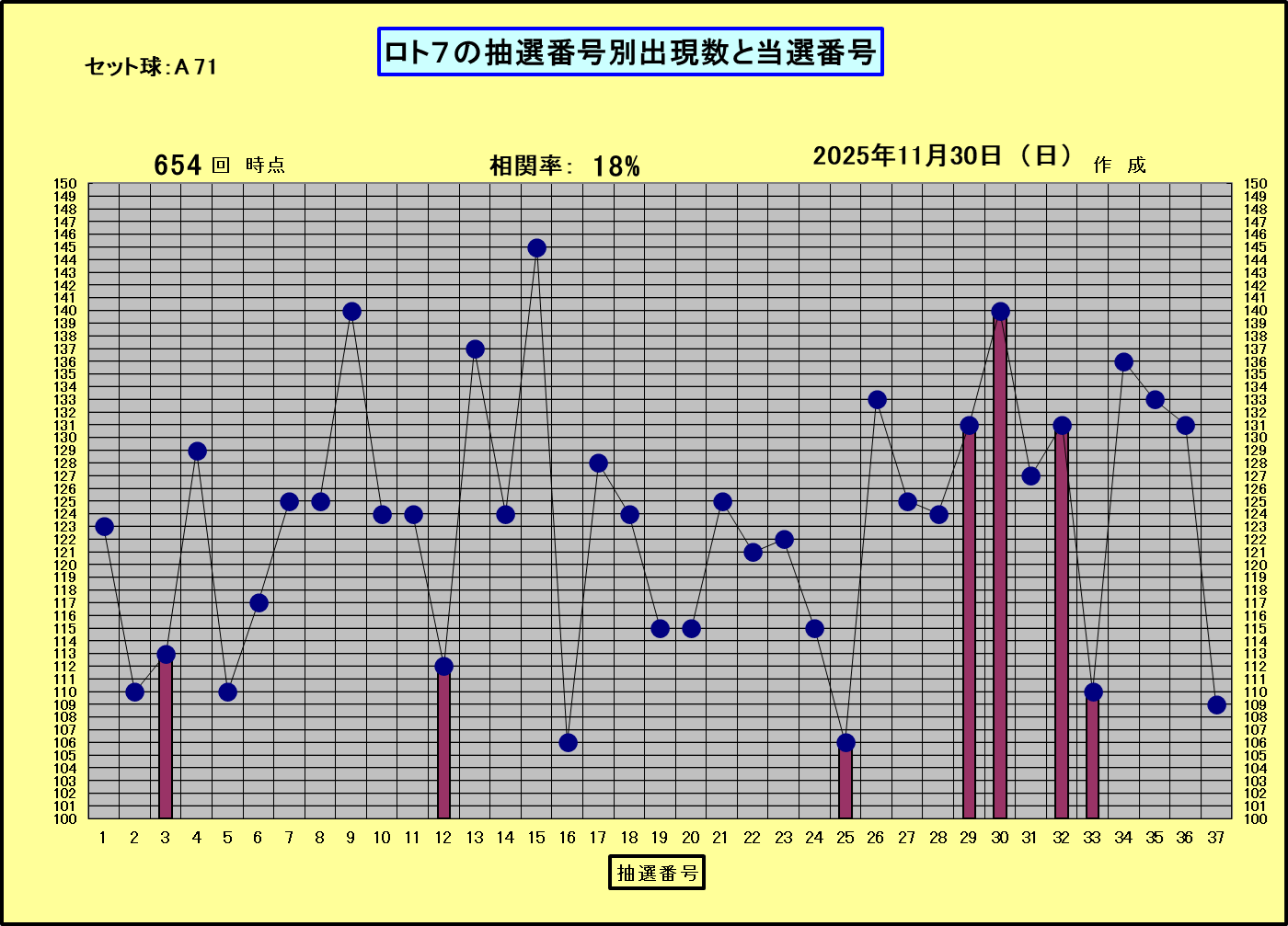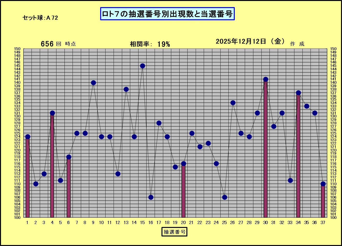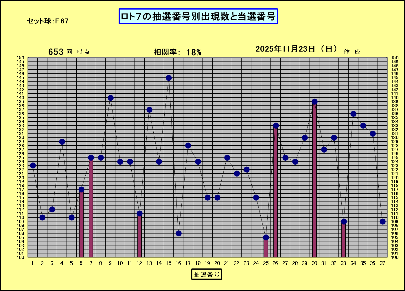 ◆ロト7の抽選番号別出現回数と当回の当選番号◆